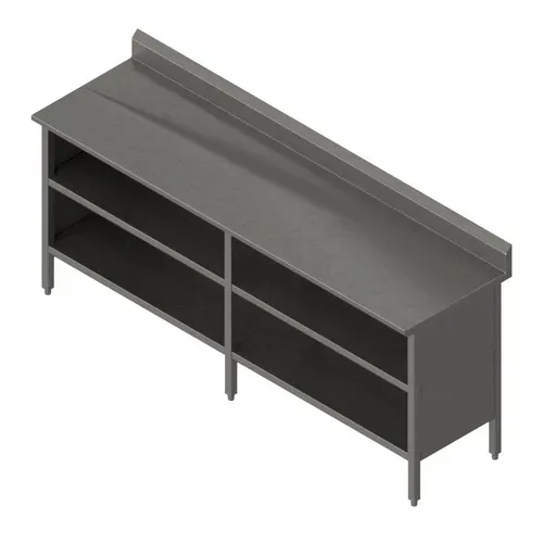 Work Table, cabinet base with open front, 120"W x 30"D, 16/300 stainless steel top with 5" backsplash, Stallion Safety Edge front, 90° turndown on sides, stainless steel base, undershelf, & 1" adjustable bullet feet, all welded set-up, NSF (image shown with optional midshelf)Q & A