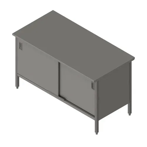 Work Table, cabinet base with sliding doors, 36"W x 24"D, 16/300 stainless steel flat top, Stallion Safety Edge front & back, 90° turndown on sides, stainless steel base, undershelf, & 1" adjustable bullet feet, all welded set-up, NSFQ & A