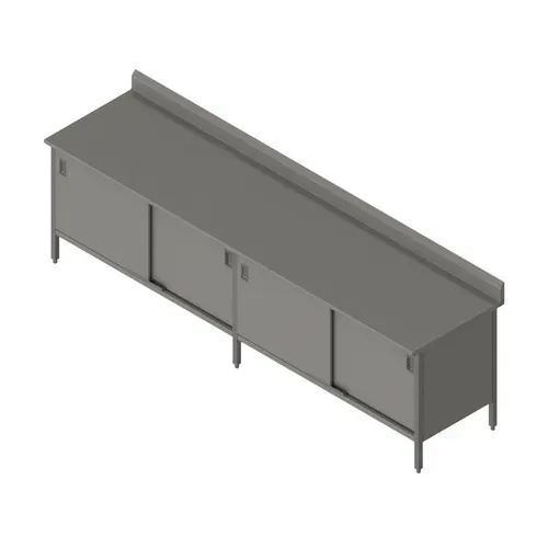 Work Table, cabinet base with sliding doors, 96"W x 30"D, 16/300 stainless steel top with 5" backsplash, Stallion Safety Edge front, 90° turndown on sides, stainless steel base, undershelf, & 1" adjustable bullet feet, all welded set-up, NSFQ & A