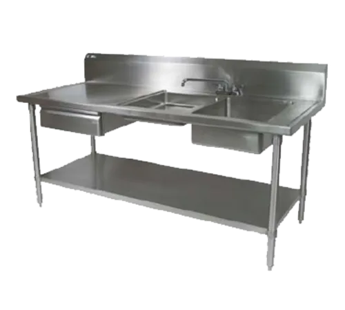 Prep Table Sink Unit, 2-compartment, 96"W x 30"D x 45-3/4"H overall size, (2) sinks located at right end, (1) 16"W x 20"D front-to-back x 8" deep sink bowl & (1) 16"W x 20"D front-to-back x 4" deep sink bowl , 10"H backsplash, includes 10" swing spout with 4" centers & Poly sliding cutting board, (1) stainless steel drawer on left, 16/300 stainless steel top, stainless steel legs, adjustable undershelf, & 1" adjustable bullet feet, NSF, CSA-SanitationQ & A