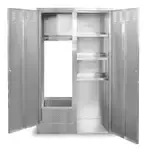 Janitor Cabinet, 48"W x 22-1/2"D x 84"H overall size, enclosed cabinet with open back for plumbing, (2) lockable louvered swing doors, right side includes: 20" x 16" x 12" deep mop sink with 3-1/2" drain, (1) over head shelf, (2) side mounted mop/broom holder with locking cam and panel-less back, left side includes: (3) shelves and bottom storage area, includes (1) service faucet with vacuum breaker and 120" hose, 18/300 stainless steel, NSFQ & A
