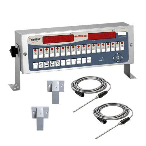 Kitchen BrainsĀ® Meridian Gas Fryer Cooking Computer Kit, 17.34" W x 7.87" D x 7.86" H, 18 programmable product keys with replaceable menu strips, (1) thermistor probe with 72" armored cable, dual 14-segment 8-character LED displays, up to 3 programmable action alarms per product key, programmable hold time linking, secure passcode programming, KorrectProduction compatible, mounting kit included, stainless steel bezel, .080 aluminum front panel, .040 aluminum chassis, polyester face with back-printed text, power 12V, 50/60 Hz, 40VA, noise spike protection 4,000 volt minimum, CE, ETL, RoHS compliantQ & A