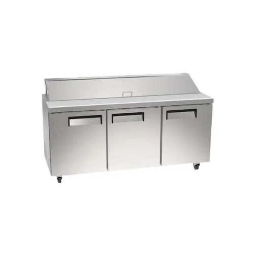 Kool-It Infinity Sandwich/Salad Prep Unit, three-section, 70-2/5"W x 29-1/2"D x 41-1/2"H, 33-40°F temperature range, includes (9) pans & cutting board, (3) solid hinged doors, (3) adjustable shelves, stainless steel interior & exterior, 4" casters (lockable in front), rear mounted self-contained refrigeration, R290 refrigerant, 4/5 HP, 115v/60/1-ph, 7.8 amps, cETLus, ETL-SanitationQ & A