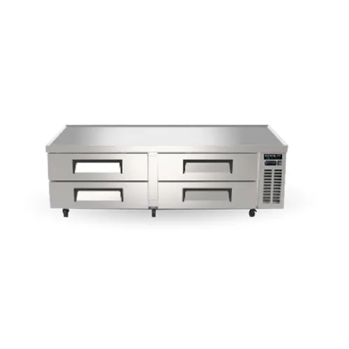 Kool-It Infinity Chef Base Refrigerator, 84"W x 32-1/10"D x 25-9/10"H, solid stainless steel top with marine edge, (4) drawers, 33°F to 40°F temperature range, digital temperature display, electronic thermostat, stainless steel front, sides & interior, 6" swivel casters with (2) locking, side mounted self-contained refrigeration, R290 refrigerant, 1/4 HP, 115v/60/1-ph, 6.84 amps, cETLus, ETL-SanitationQ & A
