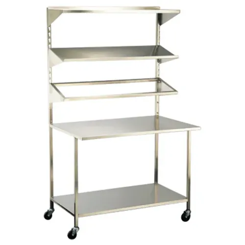 Tray Starter Station, 75"W, extended work ledge, (3) overshelves adjustable in 2" increments, each shelf holds (3) full-size pans & (1) 1/2 pan, detachable mounting brackets, stainless steel & welded base construction, 1" square tube legs mounted on (4) 3" swivel casters (2 braked), NSFQ & A