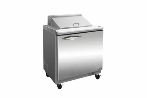 IKON Refrigeration Mega Top Sandwich / Salad Prep Unit, one-section, 7 cu. ft. capacity, 28-9/10"W x 34-1/2"D x 43-1/5"H, stainless steel top with opening for (12) 1/6 pans (included), (1) solid hinged door, (1) adjustable shelf, removable cutting board, electronic thermostat, 33° - 40°F temperature range, digital LED temperature display, automatic defrost, interior: 304 stainless steel floor, aluminum back wall, ABS side walls & door backs, stainless steel front & sides, 2-1/2" swivel casters (2) braked, rear mounted self-contained refrigeration system, R290 refrigerant, 1/3 HP, 115v/60/1-ph, 3.0 amps, NEMA 5-15P, cULus, UL EPHQ & A