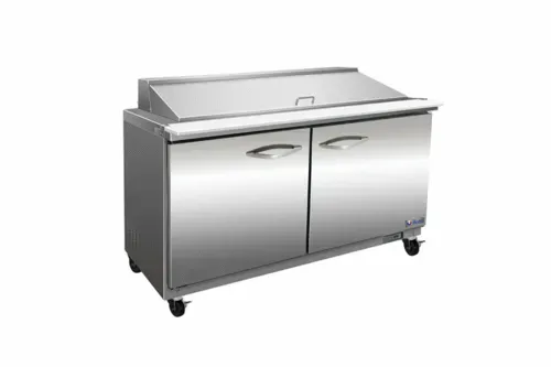 IKON Refrigeration Mega Top Sandwich / Salad Prep Unit, two-section,15.5 cu. ft. capacity, 61-1/5"W x 34-1/2"D x 43-1/5"H, stainless steel top with opening for (24) 1/6 pans (included), (2) solid hinged doors, (2) adjustable shelves, removable cutting board, electronic thermostat, 33° - 40°F temperature range, digital LED temperature display, automatic defrost, interior: 304 stainless steel floor, aluminum back wall, ABS side walls & door backs, stainless steel front & sides, 2-1/2" swivel casters (2) braked, rear mounted self-contained refrigeration system, R290 refrigerant, 1/2 HP, 115v/60/1-ph, 4.3 amps, NEMA 5-15P, cULus, UL EPHQ & A