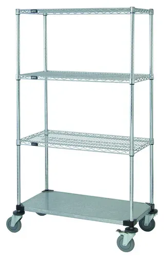 Mobile Cart, 60"W x 24"D x 80"H, includes: (3) wire shelves, (1) solid galvanized steel shelf, (4) 74"H posts, (4) donut bumpers, & (4) 5" thermoplastic resin casters (2 with brakes), chrome plated finishQ & A