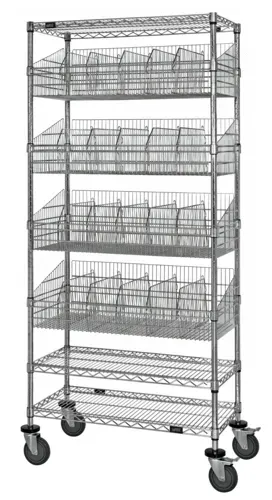 Post Basket Cart, 36"W x 24"D x 80"H, 1200 lbs. load capacity, includes: (3) wire shelves, (4) baskets, (20) dividers, bottom shelf inlay mat and (6) label holders, chrome plated finish, shipped KDQ & A