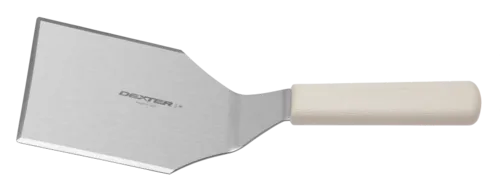 Sani-Safe® (S285-4PCP) Hamburger Turner, 5" x 4", offset, solid, beveled, heavy, balanced, stainless steel blade, textured, polypropylene white handle, Perfect Cutlery Packaging, NSF CertifiedQ & A