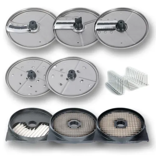 (1010483) “Restaurant” Compact Line 8 Disc Package, for vegetable processor, includes: 5/32” 4mm slicing disc (FCS-4), 5/32” 4mm shredding disc (SHS-4), 9/32” 7mm shredding disc (SHS-7), 3/8” 10mm slicing disc (FCS-10), 3/8” 10mm julienne grid (FFS-10), 3/8” 10mm dicing grid (FMS-10), DELICUT set 5/32 x 5/32” 4 x 4mm julienne disc and 5/16” 8mm dicing grid (FCES-4x4G and FMS-8), and disc/grid storage holder (1010204)Q & A