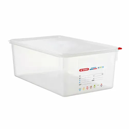 Araven - Food Storage Container, 29.6 qt., 20-7/8" x 12-3/4" x 8", GN 1/1 size, Colorclip® coded, capacity indicators, permanent label, -40° F to 203° F temperature range, dishwasher safe, polypropylene, transparent, includes airtight polyethylene lid, NSF, HACCP compliant, BPA FreeQ & A