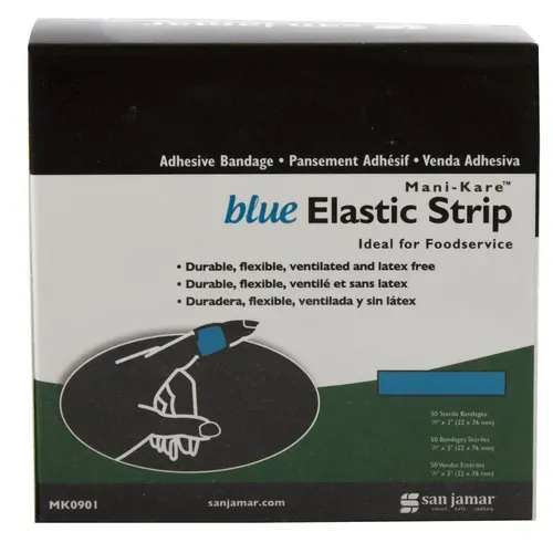 San Jamar - Mani-Kare® Bandages, 3" x 7/8", strip, flexible cloth, blue (6 boxes of 50 per pack)Q & A