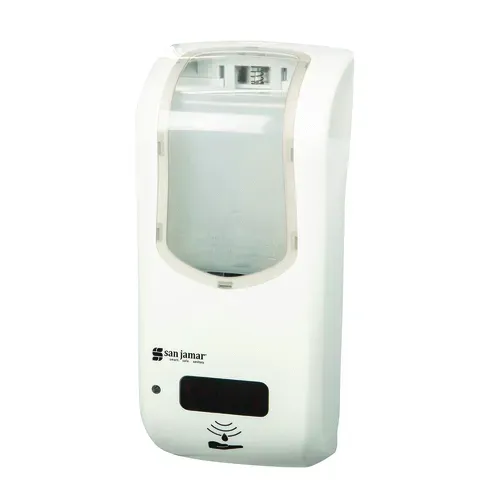 San Jamar - Summit Rely™ Hybrid Soap Dispenser, 5-1/2"W x 4"D x 12"H, 900 mL capacity, dispenses bulk liquid/lotion & hand sanitizer, electronic touchless, battery operated, manual operation when batteries are low, white/clearQ & A