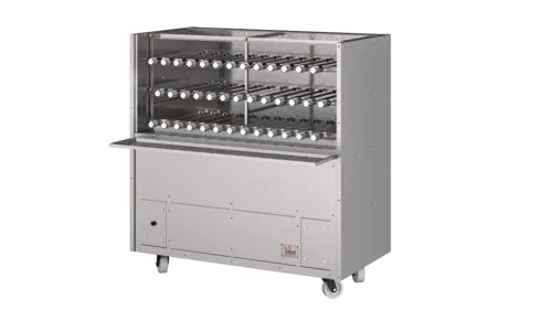 Charcoal Barbecue Grill, floor model, stainless steel construction, (23) rotating stainless steel skewers powered by a 1/4 hp motor, refractory brick box, cellular concrete and rock wool internal insulation, (4) locking casters, 127v/60hz, NSF, Made in BrazilQ & A