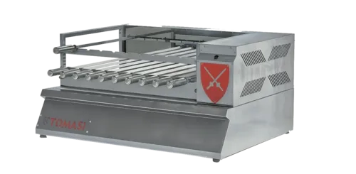 Shish Kabob Charcoal Grill, countertop modulrar system, stainless steel construction, (10) rotating stainless steel skewers powered by a 12V motor, refractory brick box, 115v/60hz, NSFQ & A