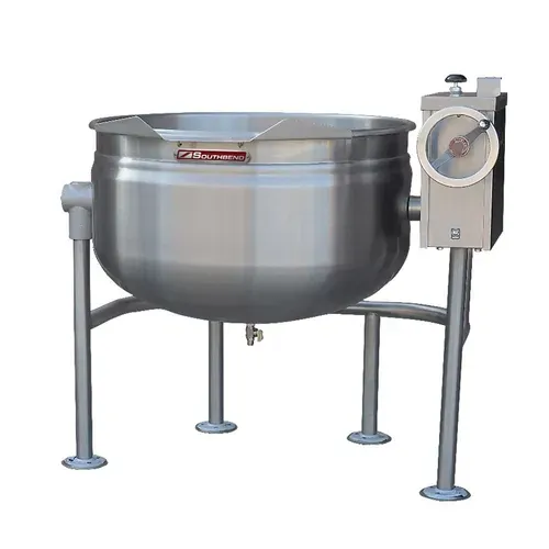Tilting Kettle, direct steam, 40 gallon capacity, full jacket, crank tilt with self-locking positive stop, 316 stainless steel interior liner, 304 stainless steel exterior, stainless steel tubular legs with adjustable flanged feet, NSFQ & A