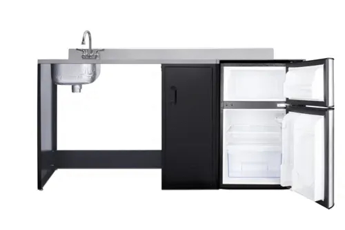 All-In-One Kitchenette, 72" wide, barrier-free, stainless steel sink & faucet left side, (1)stainless steel countertop, grooved handles, two-door refrigerator-freezer with 3.2 cu.ft., dial thermostat, reversible door, refrigerator include 3-pronged cords, black & stainless steel exterior finish, R600a refrigerant, 115v/60, 1.1 amps, ADA-compliant, ETL, ETL-Sanitation, ENERGY STARĀ® (Residential)Q & A