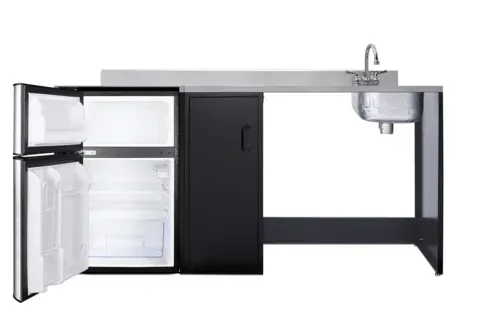 All-In-One Kitchenette, 72" wide, barrier-free, stainless steel sink & faucet right side, (1) stainless steel countertop, grooved handles, two-door refrigerator-freezer with 3.2 cu.ft., dial thermostat, reversible door, refrigerator include 3-pronged cords, black & stainless steel exterior finish, R600a refrigerant, 115v/60, 1.1 amps, ADA-compliant, ETL, ETL-Sanitation, ENERGY STARĀ® (Residential)Q & A