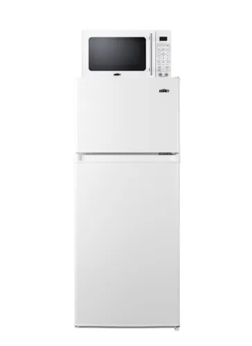 Microwave/refrigerator-freezer combination with allocator, 19" wide, 4.5 cu. ft. capacity, ENERGY STAR certified two-door mid-sized refrigerator-freezer with cycle defrost (automatic defrosting refrigerator with a static manual defrosting freezer) and deluxe interior that includes adjustable glass shelving, door racks, can holders, and a crisper, adjustable thermostat, reversible doors (refrigerator), 0.7 cu.ft of interior cooking space, door window, glass turntable (2) USB ports, end of cycle alert, mute function, digital control, pre-programmed settings for potatoes, pizza, beverages, popcorn, frozen dinners, and reheating, multistage cooking program up to 3 cooking sequences to achieve the proper heating results, multiple power levels, cook by weight function, auto defrost, express cooking, eco mode, child lock, timer, clock (microwave), ships with two removable brackets that let you secure the microwave on top of the refrigerator, built-in power allocator (plug the refrigerator into the microwave's rear outlet for easy 1-plug operation), 15 amps, 115 V AC/60 Hz, UL, ULC, R600a refrigerant, CARB compliant, 100% CFC free (Residential)Q & A