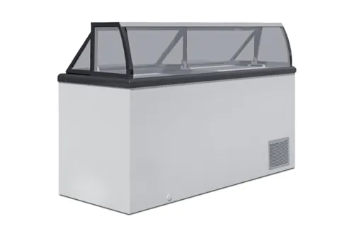 Ice Cream Scooping Cabinet, 71" wide, 19.2 cu.ft capacity, illuminated sneezeguard, electronic controls, digital thermostat (-13 to +50ºF), (6) ice cream tub holder baskets to serve from 12 11"/3 gallon round tubs, baskets include rubber brakes to prevent tubs from rotating during scooping activity, store (12) tubs in the included baskets and an additional (10) tubs underneath, (2) tempered glass lids, 3" thick insulation, manual defrost (static cooling system for improved temperature stability), engineered with a unique D-shaped evaporator, front defrost drain, white finish, heavy duty wheels with front (2) casters lockable, eco-friendly hydrocarbon-based refrigerant for a greener footprint that meets current CARB regulations, 100% CFC Free, UL, UL-C, UL-S(Commercial)Q & A