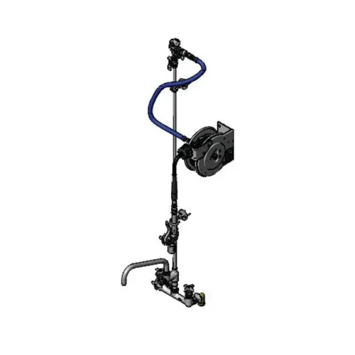 Hose Reel Assembly, 8" wall mount large flow mixing faucet with polished chrome plated brass body, add-on faucet with 12" plain end swing nozzle, large flow compression cartridges, 4-arm handles, 3/4" NPT female inlets, 8" riser, control valve, 40" riser, wall brackets, continuous pressure vacuum breaker, 36" flexible water hose connector with stainless steel quick disconnect, open stainless steel hose reel with 3/8" x 12' heavy-duty non- marking hose, ratcheting system, 0.65 GPM low flow spray valve with swivel, multi-fit bracket and adjustable hose bumper. Certified to ASSE 1056. 2019 DOE PRSV - Class I compliantQ & A