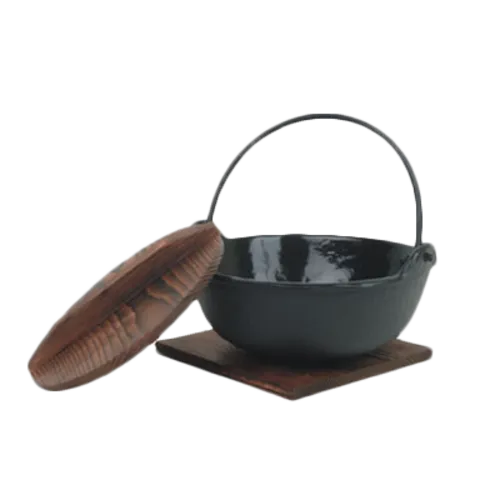 Japanese Noodle Bowl, 32 oz., round, swing handle, includes wooden lid & base, cast ironQ & A