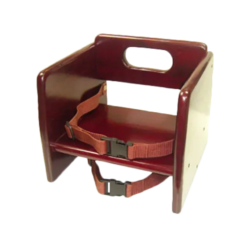 Booster Seat, 11-4/5"W x 11-4/5"D x 10-5/8"H, flippable for seat height, safety harness straps on both sides, wide stance, stackable, wood, mahogany finish, KD, ASTM ComplianceQ & A