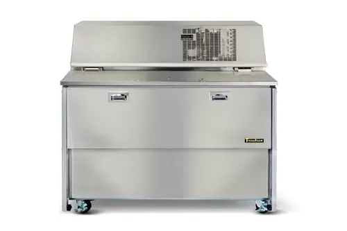 Spec-Line Forced-Air Double Access School Milk Cooler, sliding door, holds (8) 13"x13" crates or (4) 13"x19" milk crates, stainless steel interior and exterior, reinforced floor, sliding caster rails, (2) heavy-duty stainless steel dunnage racks, top-mount refrigeration system, Santoprene® E-Z clean gaskets, floor drain, 4" factory mounted adjustable casters, 1/3 hp, cETLus, NSF (more commercial refrigerators and freezers available)