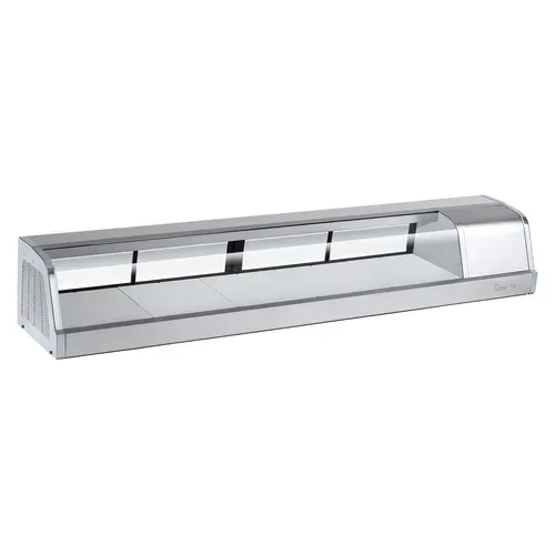 Refrigerated Sushi Case, 71-1/4"W x 14-1/8"D x 11-1/2"H, 2.1 cu. ft. capacity, self-contained compressor located on the right from the customer side view, top glass angles down, 304 stainless steel exterior body & food plates, (4) tempered glass rear sliding doors with handles, (5) bottom shelves, 1" drain, ambient temperature range 50-80°F, saturation 39°F,R290 Hydrocarbon refrigerant, 1/6 HP, 115v/60/1-ph, 4.6 amps, NEMA 5-15P, cCSAus, CSA-SanitationQ & A
