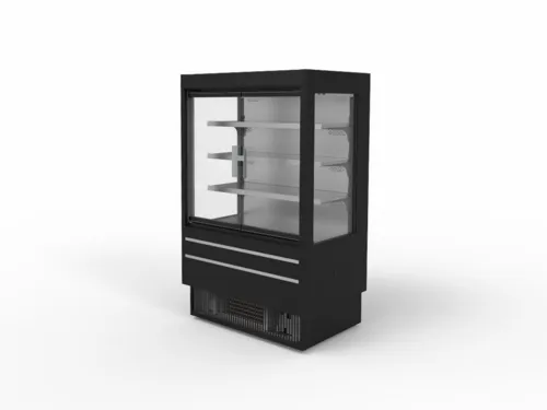 Vertical Air Curtain Open Display Merchandiser, medium-height slim profile, 10.4 cu. ft. capacity, 39-3/8"W x 25-3/4"D x 60-3/4"H, self-contained refrigeration with self-cleaning condenser, LED interior lighting, (3) solid shelves, R290 Hydrocarbon refrigerant, Stainless steel interior and shelves, Black coated exterior and front glass doors, Back-guard improves airflow, CFC free, Front air intake and rear air discharge, 3/4 HP, 115v/60/1-ph, 8 amps, cord with NEMA 5-15P, cETLus, ETL-Sanitation (contact your sales representative for more details to order)Q & A