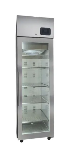 Meat Curing Aging Cabinet, 16.7 cu ft., 24-3/8"W, electronic digital temperature control with alarms; temperature range 37ºF to 86ºF; waterless digital humidity control; includes 4 pairs of shelf supports; fits 15 3/4"W x 23 5/8"W pans, glass door, (1) glass doors, autodefrost, (4) perforated metal shelves, 11 ft, Brightshield® antimicrobial LED lighting; high efficiency compressor top mount; high efficiency evaporator coil & condenser, AISI 304 stainless steel interior and exterior with lock; CFC-free high density polyurethane insulated cabinet; epoxy coated sealed evaporator, includes 4 casters (2 locking), 220v/60 Hz/1ph, NEMA 6-20P, NSF, cULusQ & A