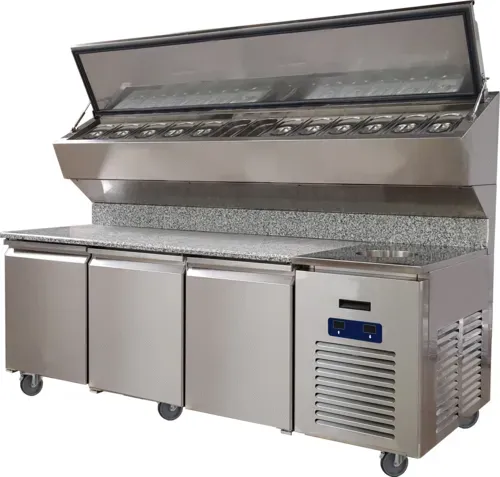 Refrigerated Pizza Prep Table with Cold Wall Sealed Condiment Rail, 21 cu ft, 96"W, (3) refrigerated doors, autodefrost, cfc-free high-density polyurethane insulated cabinet, electronic digital temperature control with alarms, epoxy coated sealed evaporator, ucps596-ss61a, 3, cold wall sealed glass-top condiment rail, (3) epoxy coated wire shelves, marble top, round sauce pan, 1/3 size adapter bars for top opening supplied, factory pre-wired for dedicated outlet, self-lubricating sealed cast iron evaporator fan motor with high volume airflow, pans not included, temperature range base 28ºF to 46ºF, condiment rail 35ºF to 50ºF, r449a refrigerant 49 oz (1.4 kg), high efficiency side-mount compressor, interior rounded corners for easy cleaning, aisi 304 stainless steel interior and exterior, casters (2 locking) included, 9 amps, 115/60/1, NEMA 5-15P, 11 ft cordQ & A