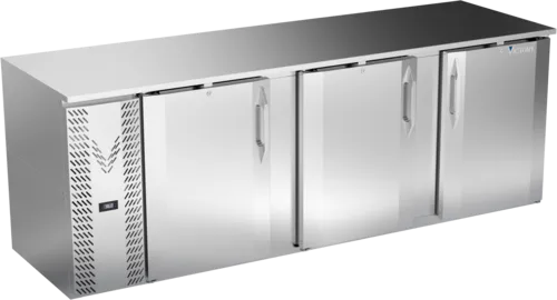Back Bar Refrigerator, three-section, 94"W x 30-1/8"D x 34"H, 32.768 cu. ft., (3) solid self-closing doors with 120º stay-open feature, magnetic door gasket with door locks, full electronic control, (6) epoxy coated steel shelves, (4) 1/2 barrel kegs, LED lighting, 1" stainless steel top, stainless steel exterior, galvanized interior, stainless steel floor, R290 Hydrocarbon refrigerant, 1/3 HP, 3.3 amps, 115v/60/1-ph, NEMA 5-15P, cULus, UL EPH ClassifiedQ & A