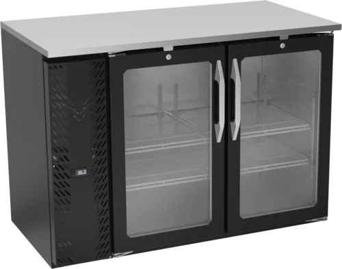 Back Bar Refrigerator, Food Rated, two-section, 48"W x 25-11/16”D x 34"H, 12.56 cu. ft., (2) self-closing glass doors with 120º stay-open feature, magnetic door gasket with door locks, full electronic control, (4) epoxy coated steel shelves, (2) 1/2 barrel kegs, LED lighting, 1" stainless steel top, black exterior finish, stainless steel Interior, R290 Hydrocarbon refrigerant, 1/4 HP, 3 amps, 115v/60/1-ph, NEMA 5-15P, cULus, UL EPH ClassifiedQ & A