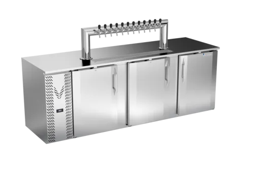 Direct Draw Dispenser, 94"W x 30-1/8"D x 49-7/8"H, 37.82 cu. ft., (3) doors, (5) 1/2 keg capacity, door locks, (12) tap tower, stainless steel exterior & top, galvanized interior with reinforced stainless steel floor, self-contained refrigeration, R290 Hydrocarbon refrigerant, 1/3 HP, 3.3 amps, NEMA 5-15P, 115v/60/1-ph, cULus, UL EPH ClassifiedQ & A