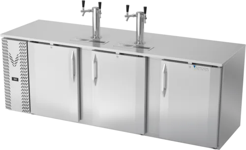 Direct Draw Dispenser, 94"W x 30-1/8"D x 49-5/16"H, 32.768 cu. ft., (3) doors, (5) 1/2 keg capacity, door locks, (2) dual faucet columns, stainless steel top & front, galvanized interior with reinforced stainless steel floor, self-contained refrigeration, R290 Hydrocarbon refrigerant, 1/3 HP, 3.3 amps, NEMA 5-15P, 115v/60/1-ph, cULus, UL EPH ClassifiedQ & A