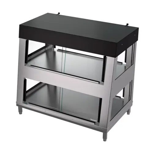Heated Display Case, countertop, full service, 42.50"W x 41.26"D x 34.61"H, humidity controlled with hidden fans extracting humid air, user-adjustable overhead radiant heat with pre-set shelf heat, LED lighting on both shelves, wire racks included on top shelves, bottom shelves hold full-size steam-table pans up to 4" deep, lift-and-remove sliding doors with handles on both sides, side glass panels for product visibility, 4" adjustable legs or countertop seal option, magnetic 400-series stainless steel, 208–240 volts, 1924–2562 watts, 9.3–10.7 amps, NEMA 6-20P plug, cULus, UL EPH Classified (1 year standard warranty)Q & A