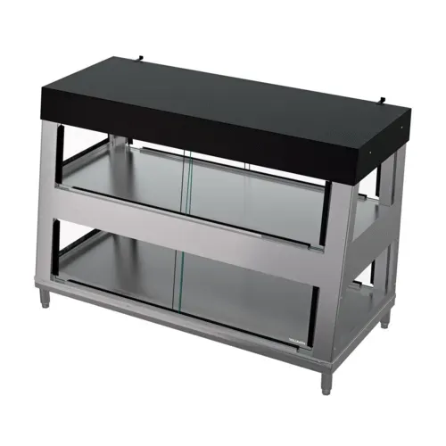 Heated Display Case, countertop, full service, 55.75"W x 54.51"H x 55.09"D, humidity controlled by hidden fans extracting humid air, user-adjustable overhead radiant heat with pre-set shelf heat, LED lighting on both shelves, lift-and-remove sliding glass doors with handles on both sides, bottom shelves hold full-size steam-table pans up to 4" deep, wire racks included for top shelves, magnetic 400-series stainless steel, 4" adjustable legs (optional), 2533–3372 watts, 12.2–14.1 amps, 208–240 volts, NEMA 6-20P plug, cULus, UL EPH Classified (1 year standard warranty)Q & A